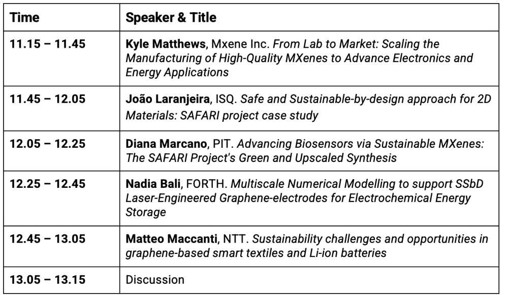 Participate in this joint workshop to discover the groundbreaking, innovative, and transformative potential of safe and sustainable-by-design 2D materials. From scalable manufacturing to applications in energy, electronics, biotechnology, and EMI shielding. Explore how GRAPHERGIA and SAFARI are pushing technological boundaries to develop eco-friendly, high-performance materials that could power devices, systems and other solutions of tomorrow.