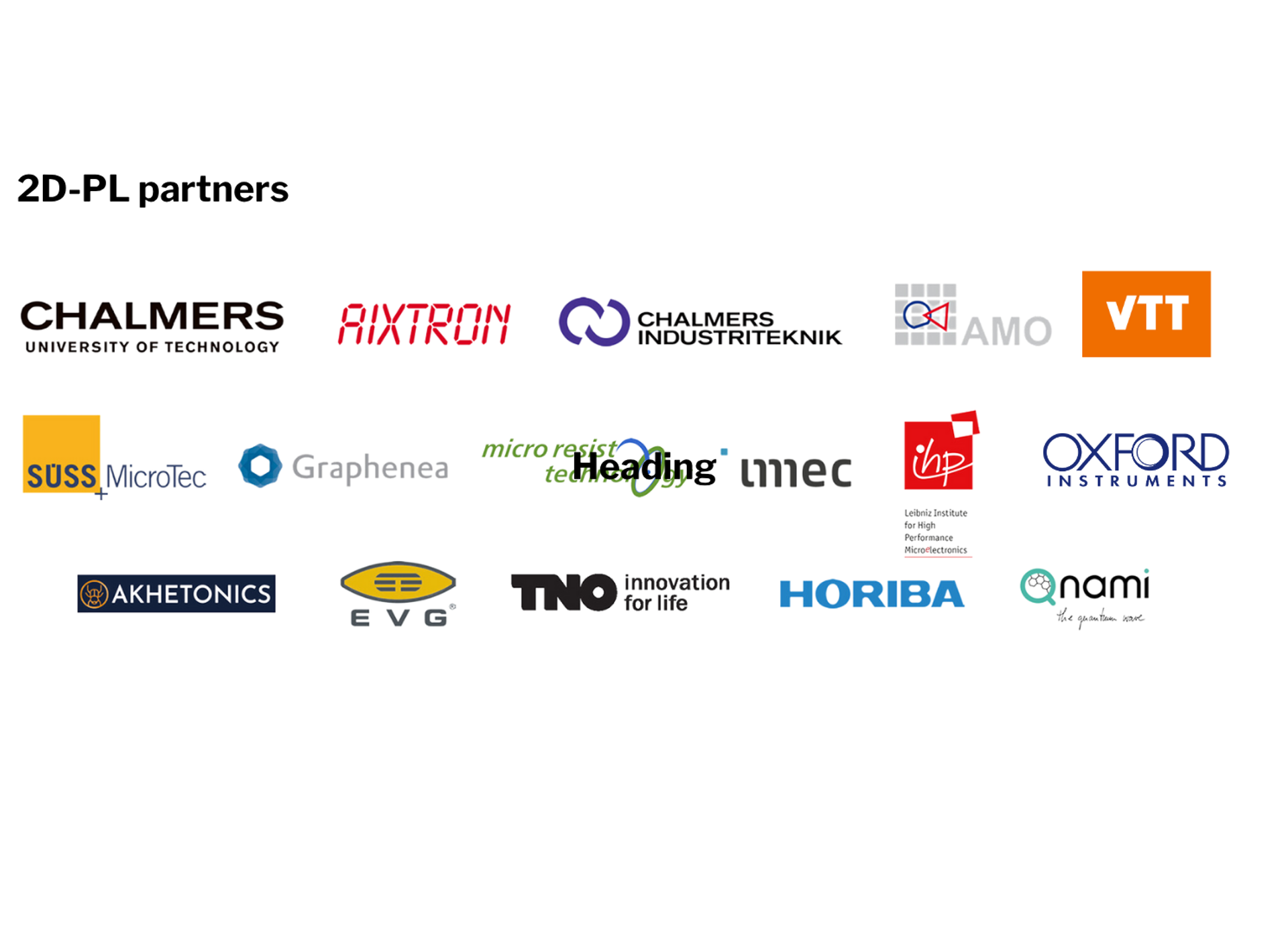 The 2D Pilot Line gathers European players covering the whole value chain, including tool manufacturers, chemical and material providers and semiconductor fabrication lines. IMEC, Aixtron, AMO GmbH, Micro Resist Technology, SUSS Micro Tec, IHP - Leibniz Institute for High Performance Microelectronics, VTT, Graphenea Semiconductor SL, Chalmers University of Technology, Oxford Instruments, TNO, EVG, Akhetonics GmbH, HORIBA, Qnami, Chalmers Industrial Technology.