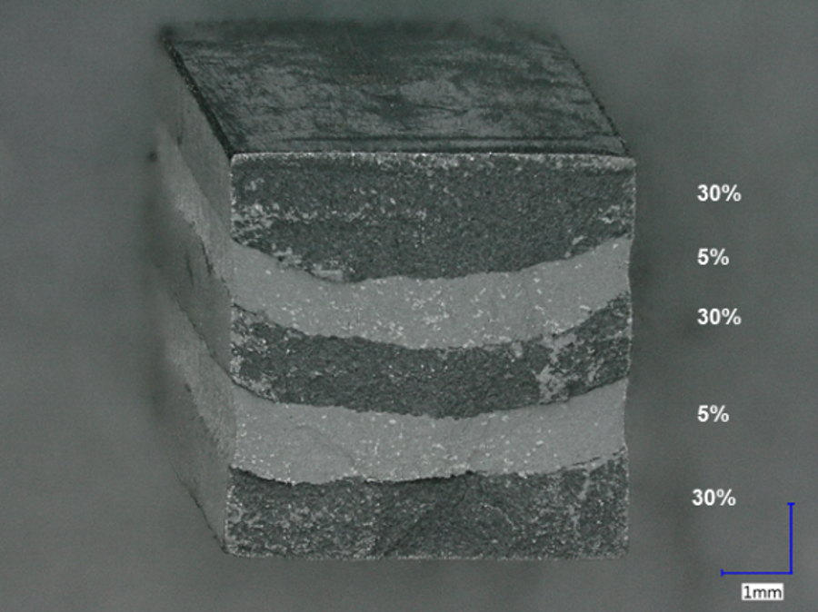 Sintered sample made of five-layered Si3N4/graphene composite with 5% or 30% graphene by weight. Credit: CERANEA