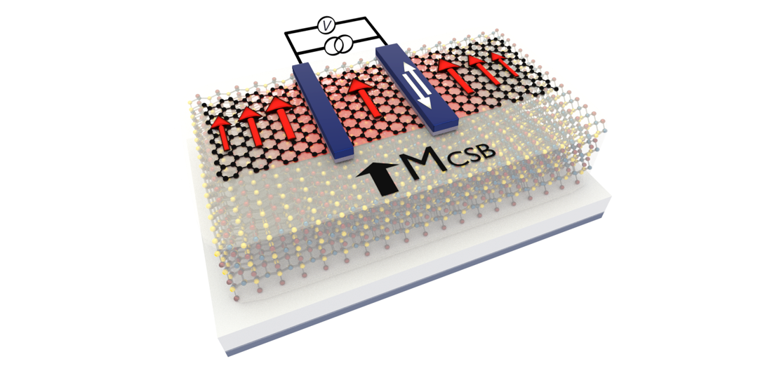 Caption: Schematic of the studied device, showing the electrical and thermal generation of spin currents in a bilayer graphene/CrSBr heterostructure. The magnetic cobalt electrodes are used to determine the proximity induced spin polarisation in the bilayer graphene, whereas the magnetisation of the outermost layer of CrSBr (MCSB) allows for higher conductivity of the spin-up electrons (red arrows). Credit: Talieh S. Ghiasi
